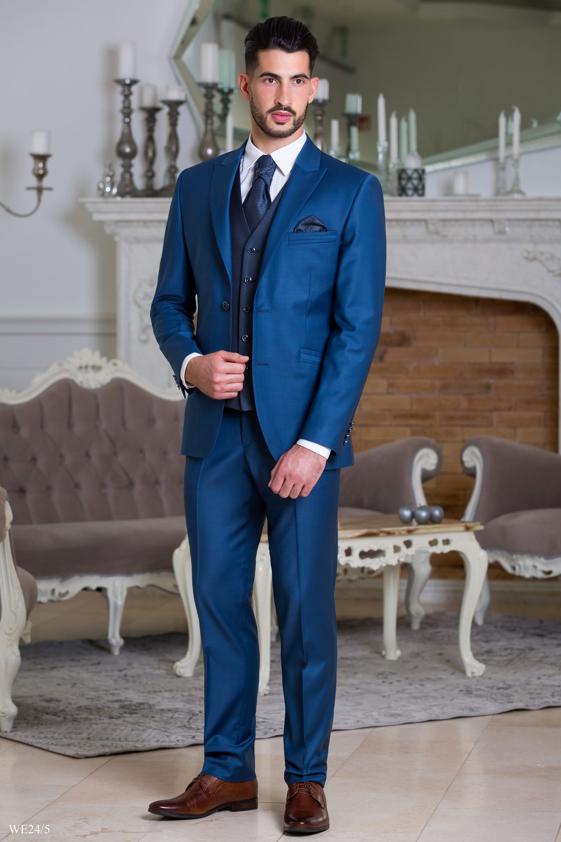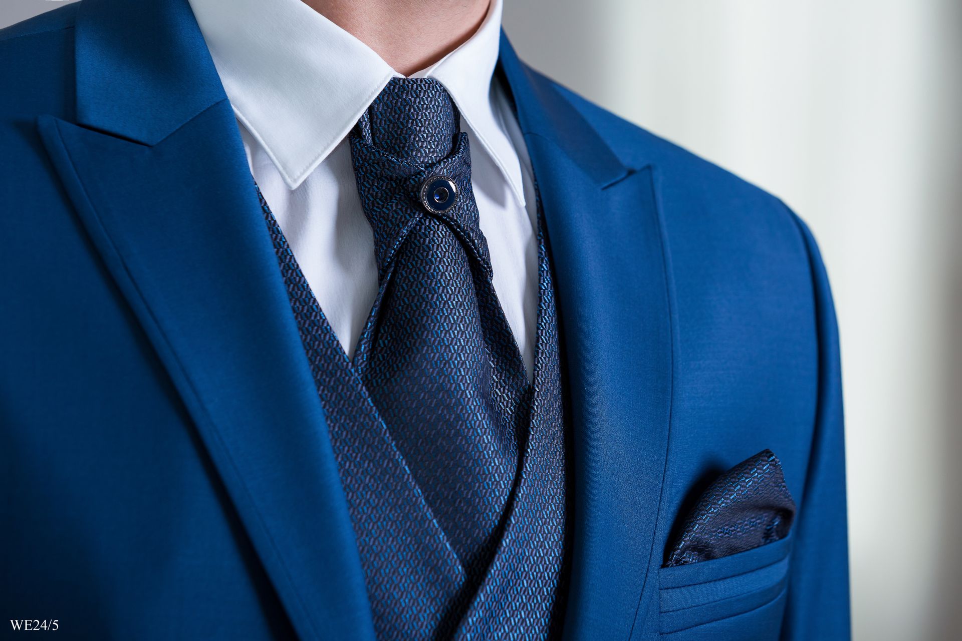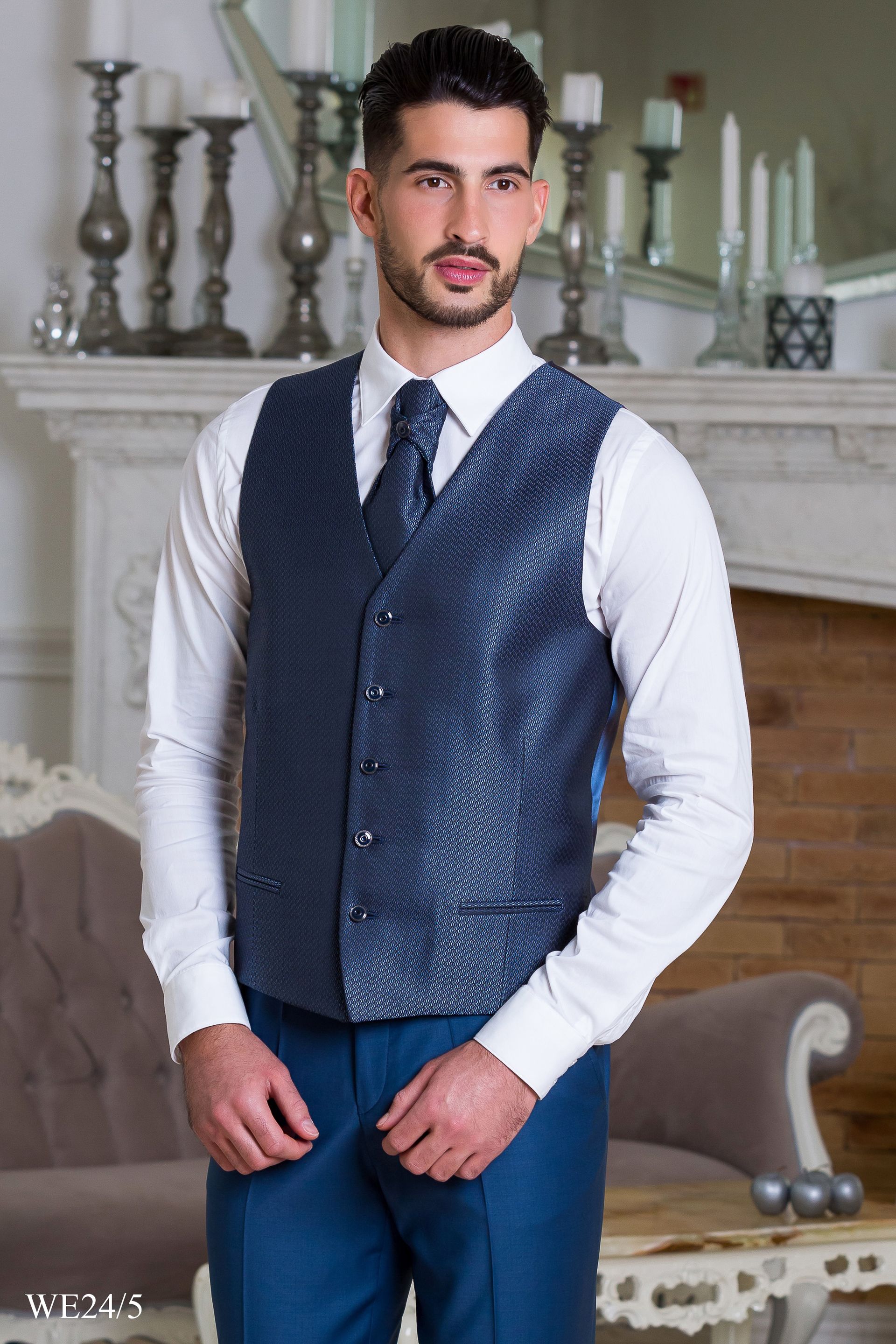 Kék öltöny sötétkék szatén mellénnyel