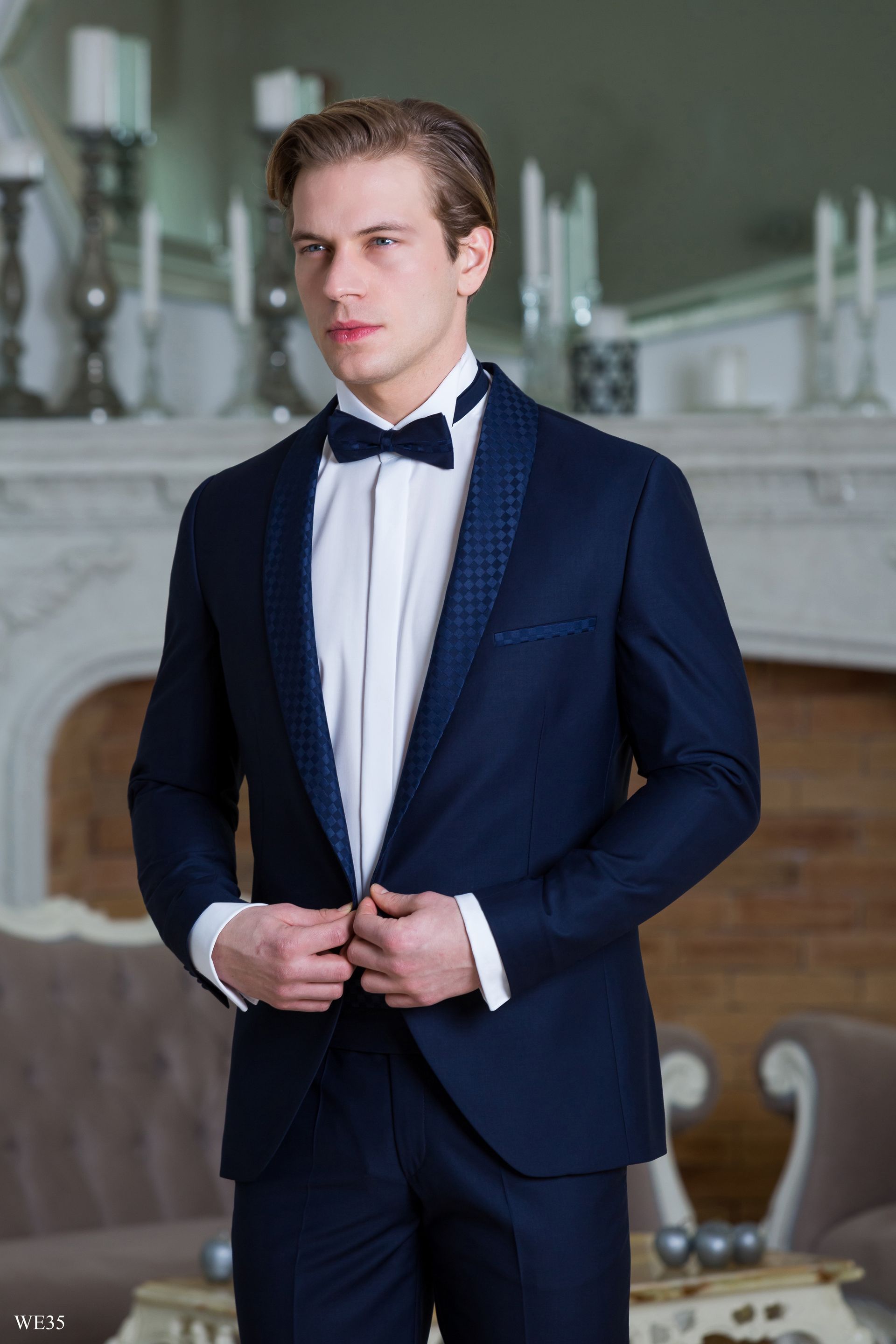 Sötétkék duplasoros szmoking kockás szaténnal