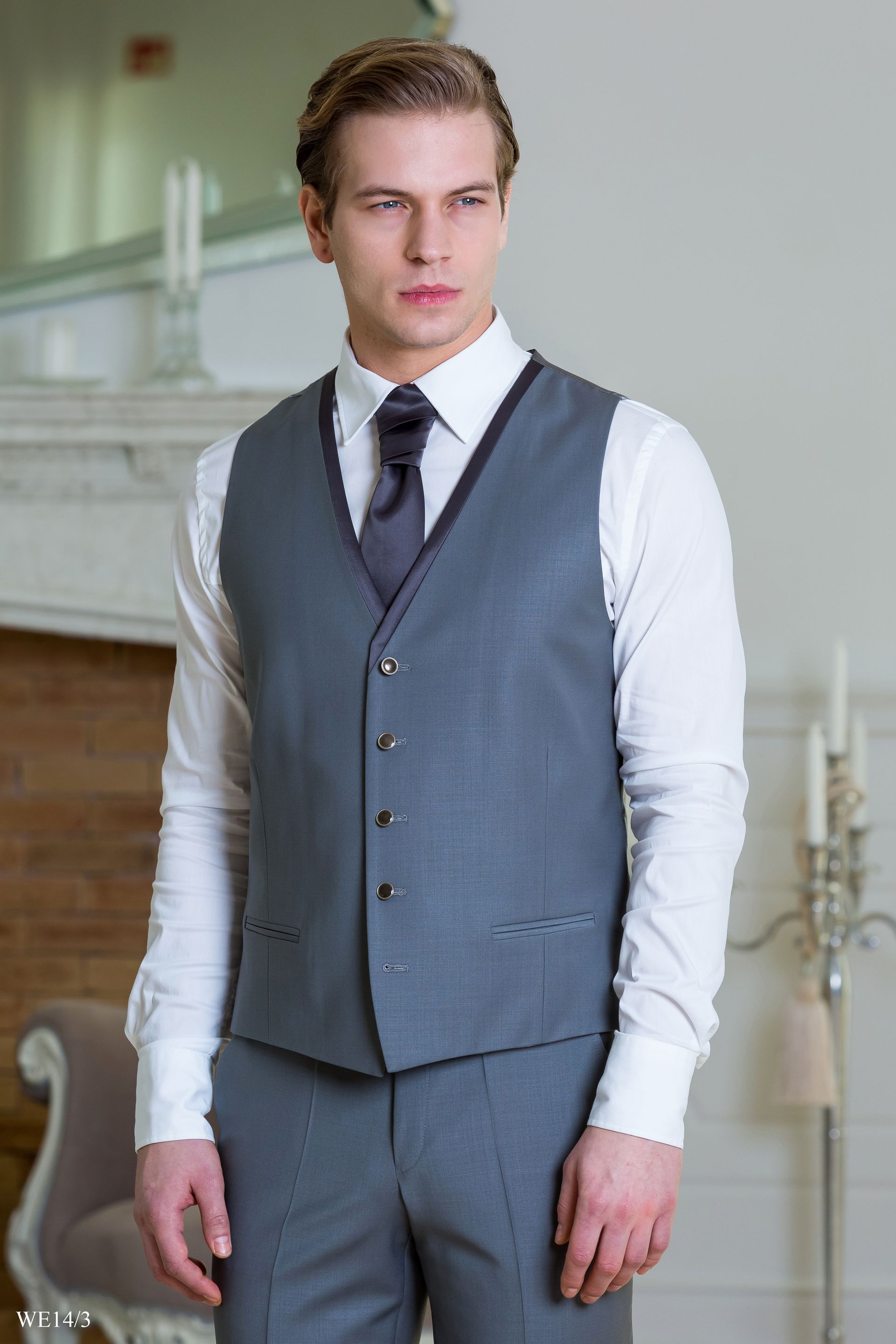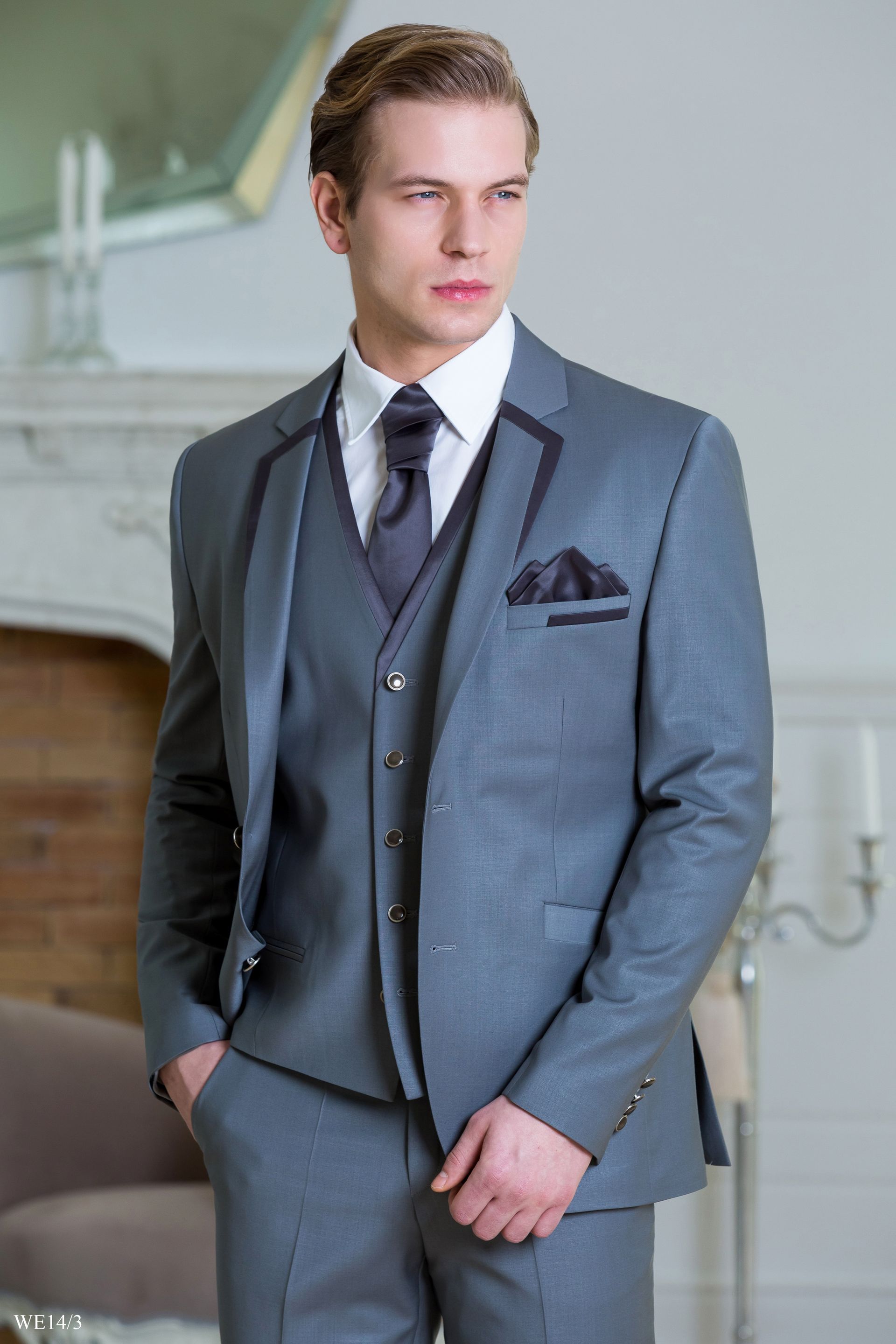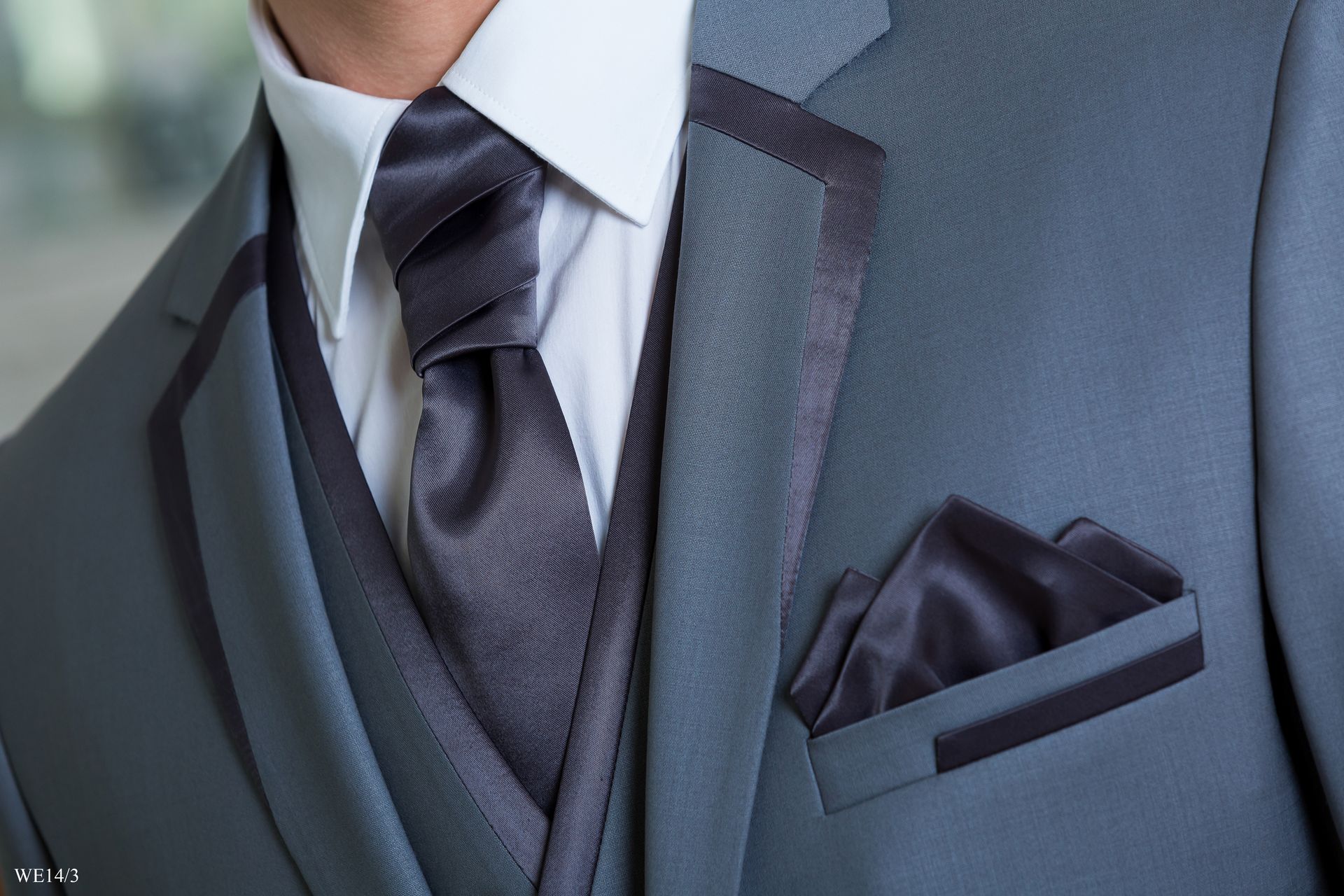 Szürke öltöny sötétkék szaténnal szabott