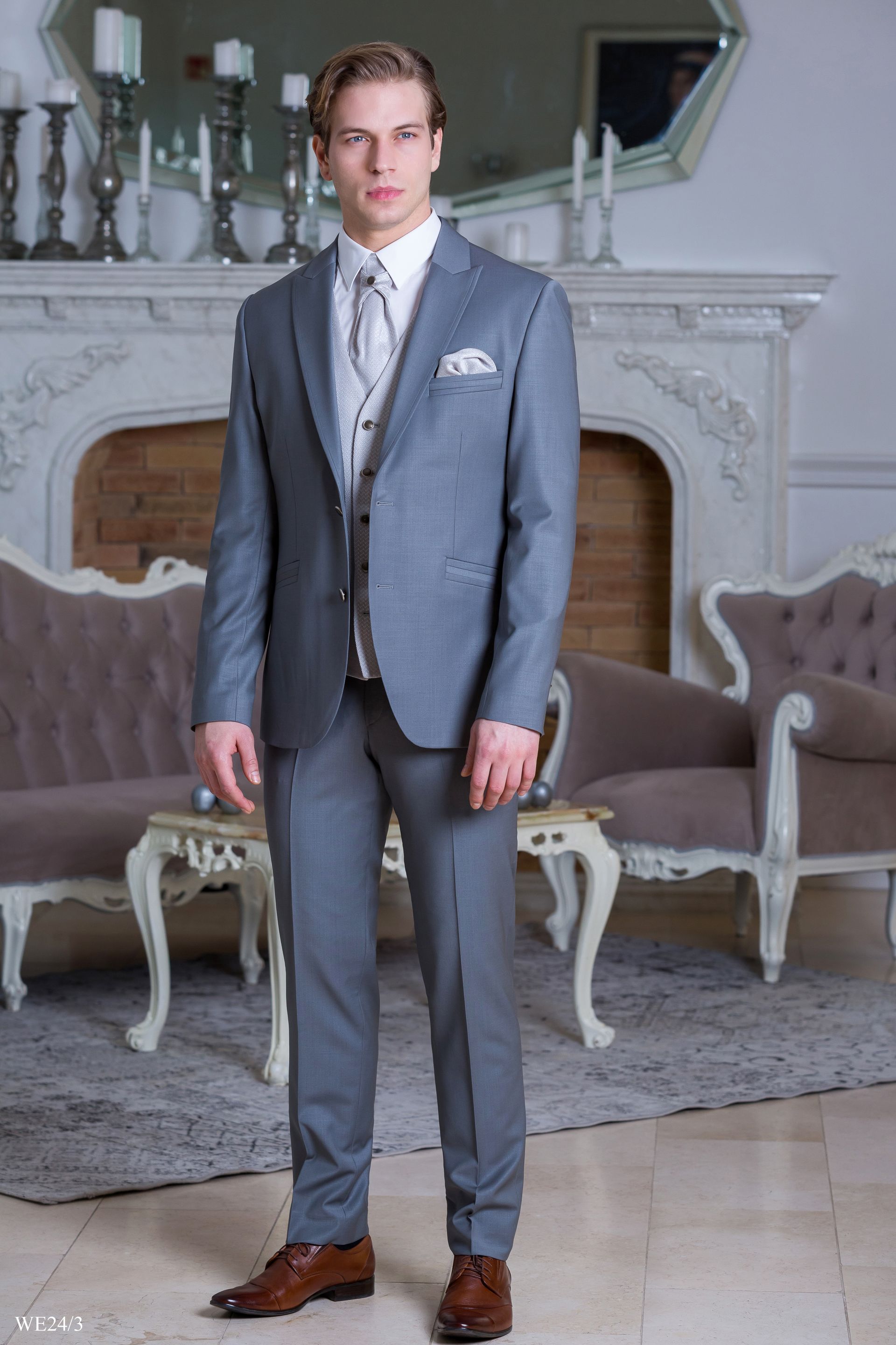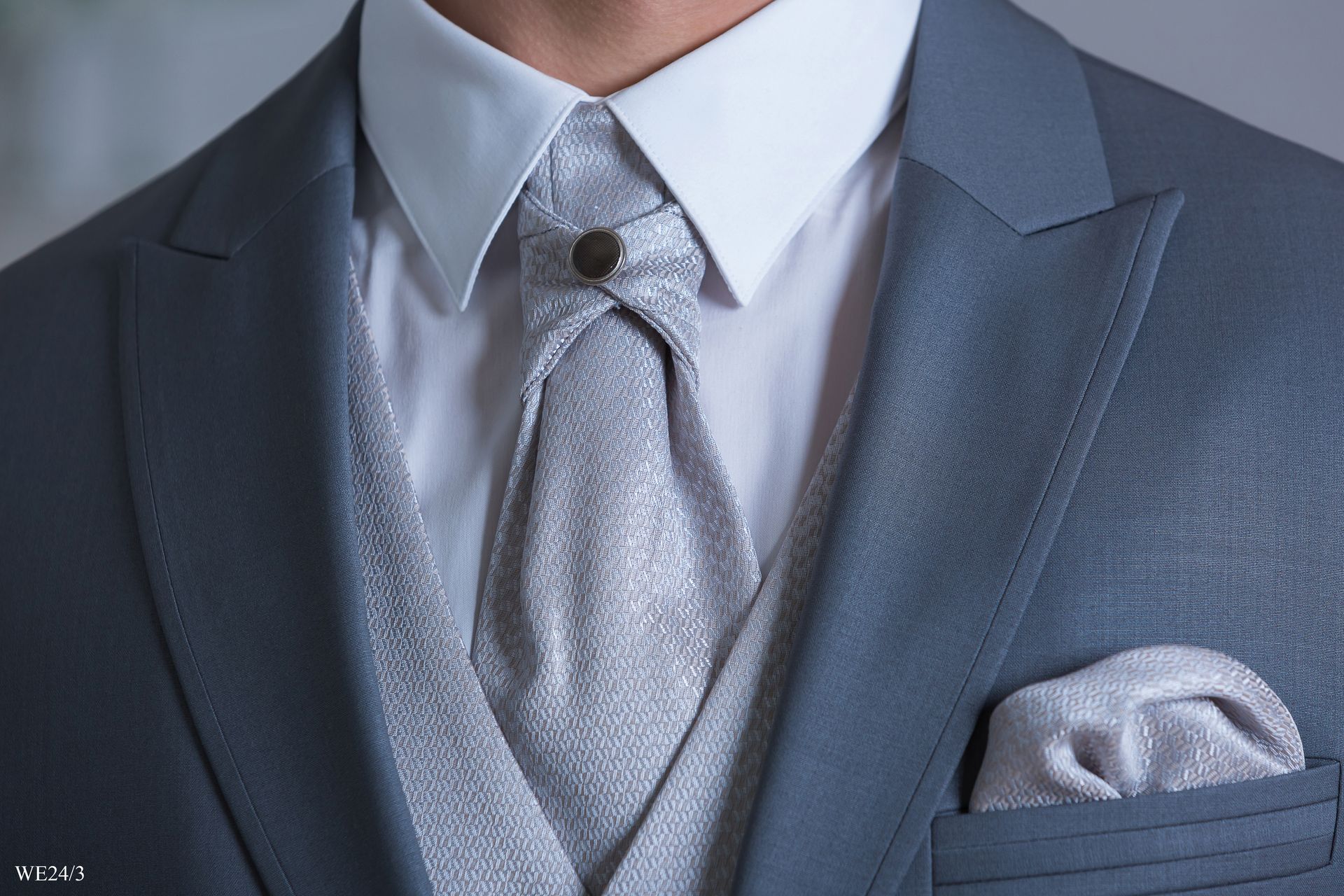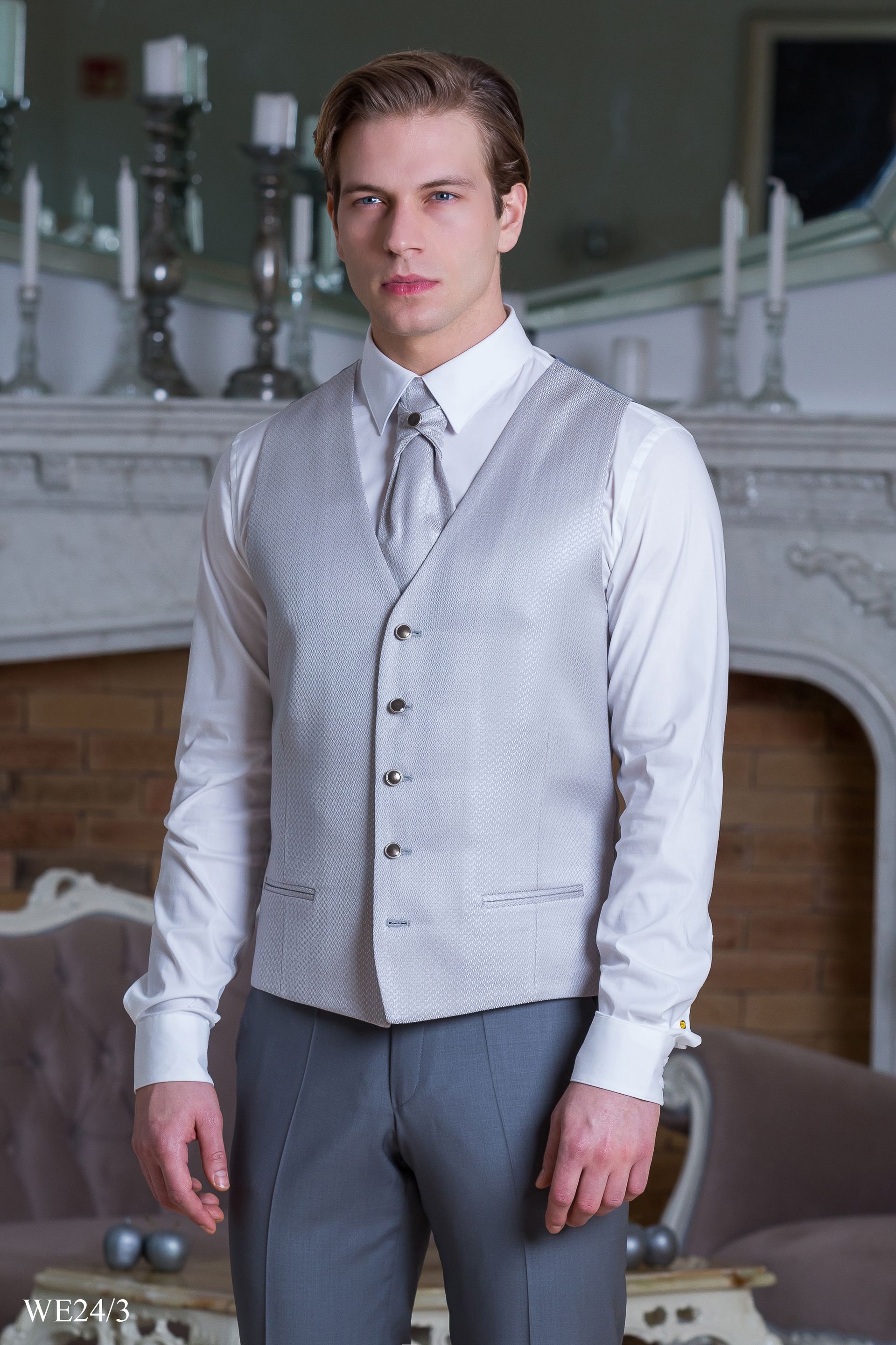 Világosszürke öltöny ezüst szatén mellénnyel